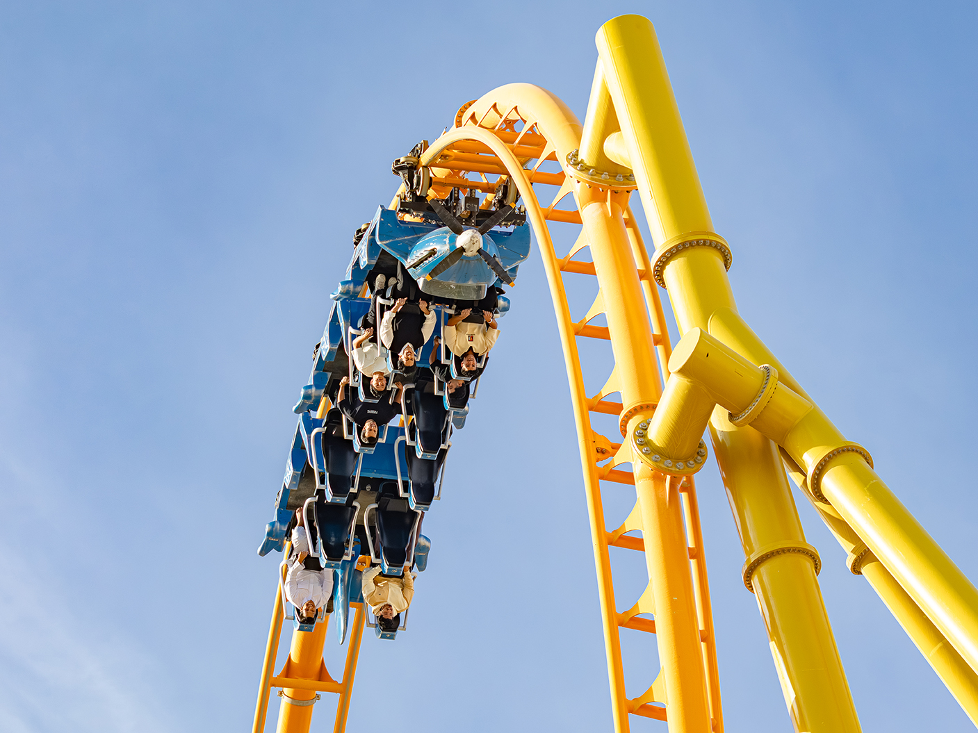 The train then rolls forward again to the launch one last time, reaching a top speed of 127 km/h and allowing the train to pass through the world’s tallest inversion, an Inverted Top Hat, giving riders thrilling upside-down views of Six Flags Qiddiya City and Falcons Flight. The train then enters a gravity run, and a strong airtime jump into the brakes.